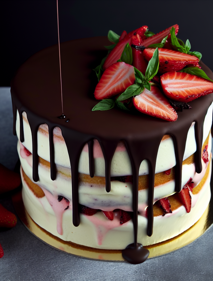 A luscious vanilla bean cake layered with fresh strawberry-basil icing and topped with decadent dairy-free chocolate ganache drips for an elegant, flavorful dessert.