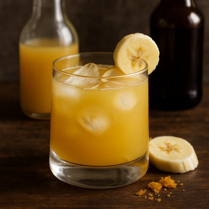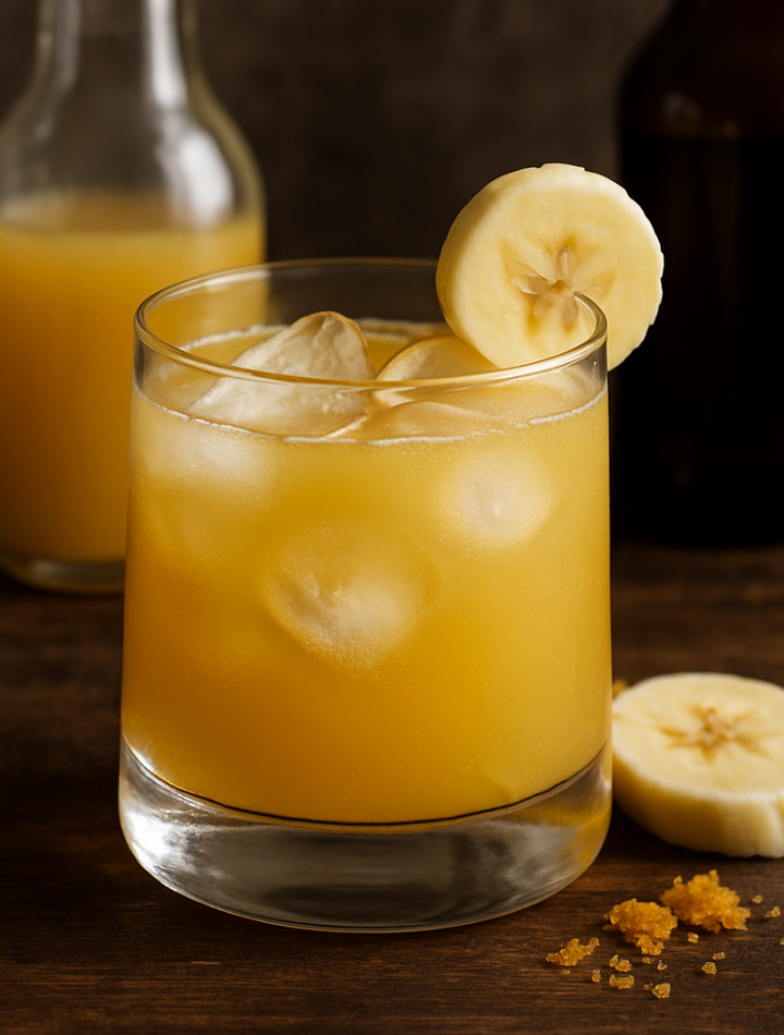 A smooth and refreshing tropical cocktail blending rich dark rum with naturally sweet banana juice and a touch of palm sugar for a delightful twist.