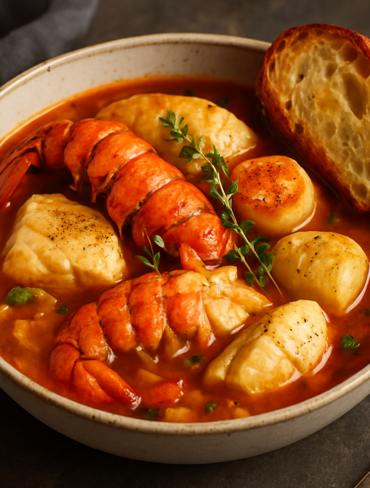 A fragrant and hearty Provençal fish stew combining tender cod, lobster tails, halibut, and scallops simmered in a rich saffron and tomato broth with aromatic herbs and spices.