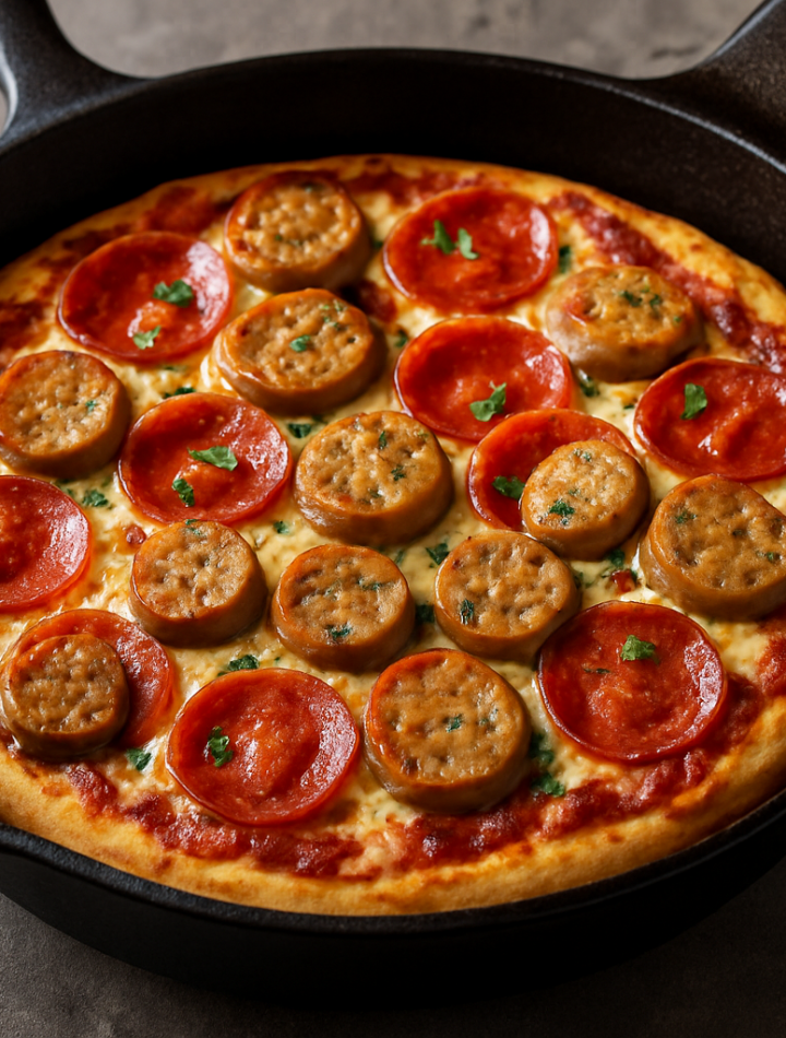 A deliciously cheesy skillet pizza topped with savory Johnsonville Three Cheese Italian Chicken Sausage and classic pepperoni, perfect for a quick and satisfying meal.