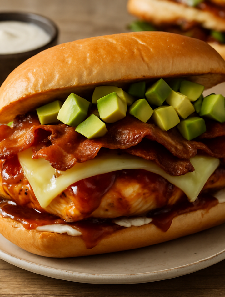A hearty and flavorful chicken sandwich layered with smoky bacon, melty Swiss cheese, creamy avocado, and tangy Ranch dressing on a toasted hoagie roll.
