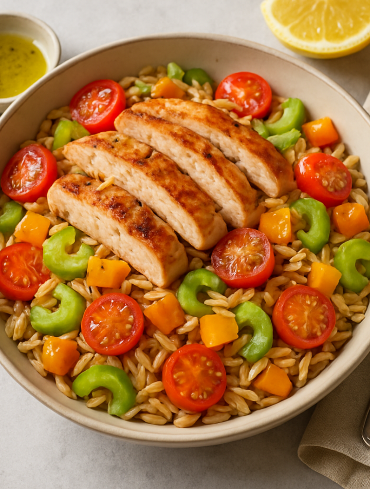 A vibrant, warm salad featuring tender chicken, zesty lemon, sweet cherry tomatoes, and crunchy celery tossed with whole wheat orzo and a fragrant oregano olive oil dressing.