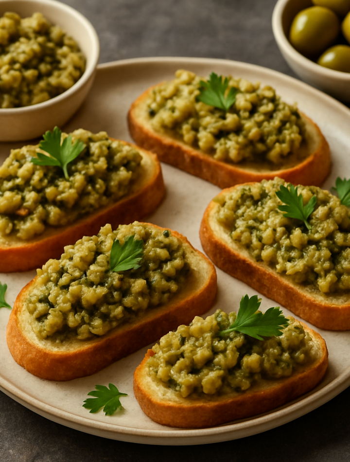 Crunchy baguette slices topped with a rich, tangy spread of green olives, walnuts, anchovies, and garlic, perfect for an elegant appetizer or snack.