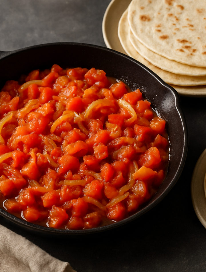 A simple and delicious sauté of fresh tomato, onion, and garlic served warm with toasted flour tortillas for a comforting, homemade snack or light meal.