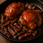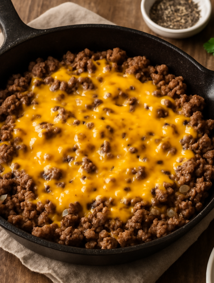 A savory skillet dish combining juicy ground beef, caramelized onions, and melted cheddar cheese with garlic and black pepper for a comforting, flavorful meal.