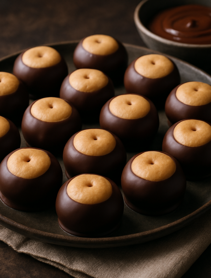 Sweet and nutty peanut butter balls dipped in rich chocolate, leaving a small circle of peanut butter exposed for that iconic buckeye look.