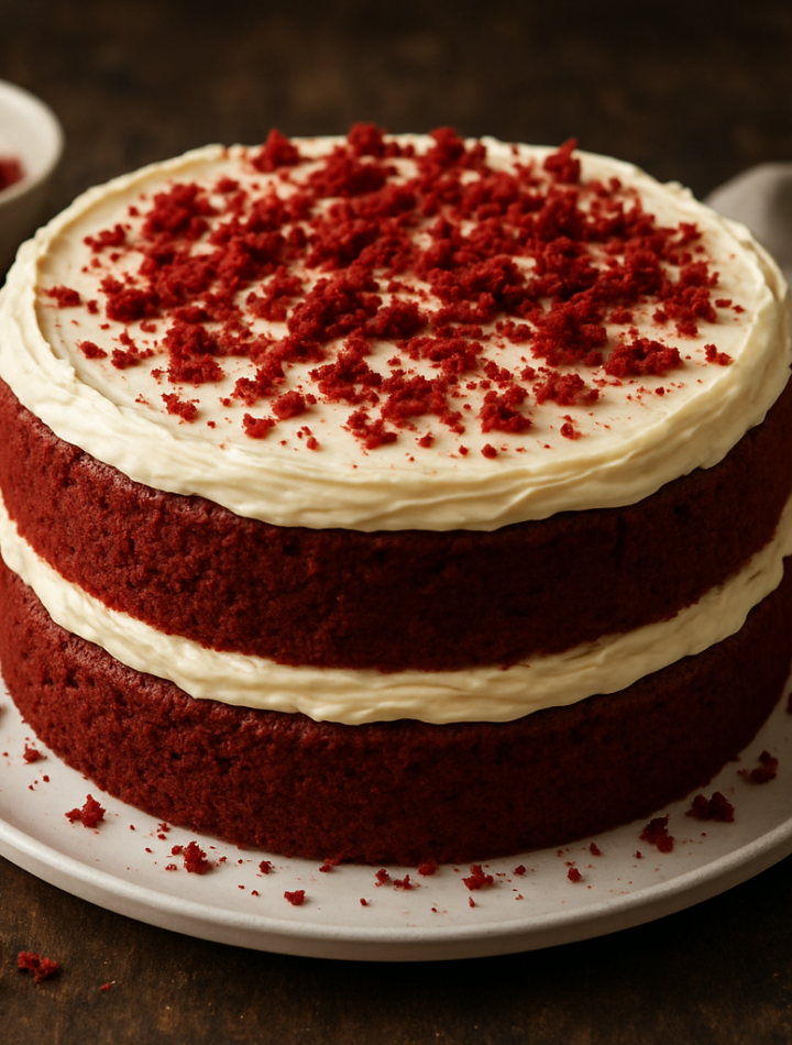 A moist and tender red velvet cake with a hint of cinnamon and cocoa, perfectly balanced with creamy sweetness.