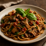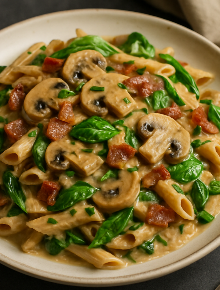 A hearty whole wheat pasta dish with crispy bacon, earthy mushrooms, fresh spinach, and a rich, wine-infused sauce brightened with herbs.