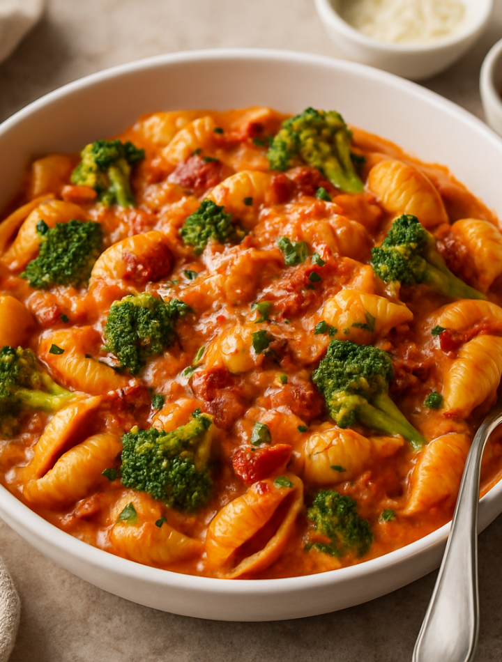 Tender pasta shells tossed in a savory tomato sauce enriched with crispy bacon, tender broccoli, and a touch of creamy half-and-half for comforting every bite.