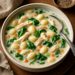 • Gradually add chicken broth and milk, stirring constantly, and cook over medium heat for about 2 minutes until heated through.