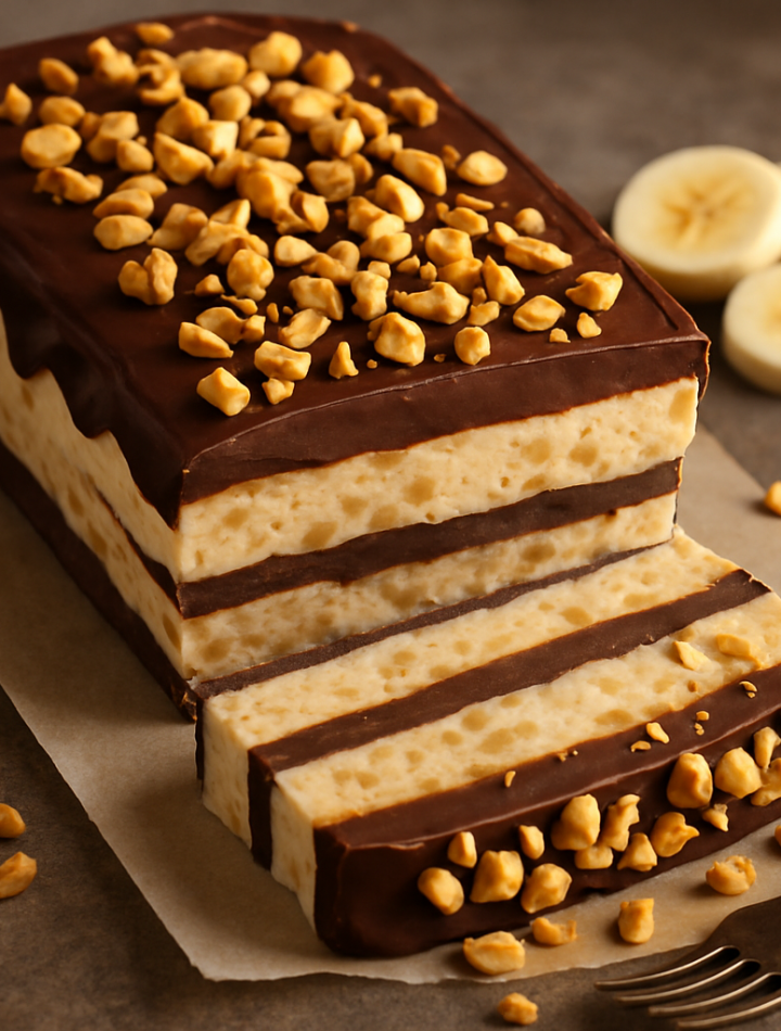 A luscious no-bake frozen loaf combining creamy peanut butter, ripe bananas, and rich semisweet chocolate, perfect for a cool, sweet treat.