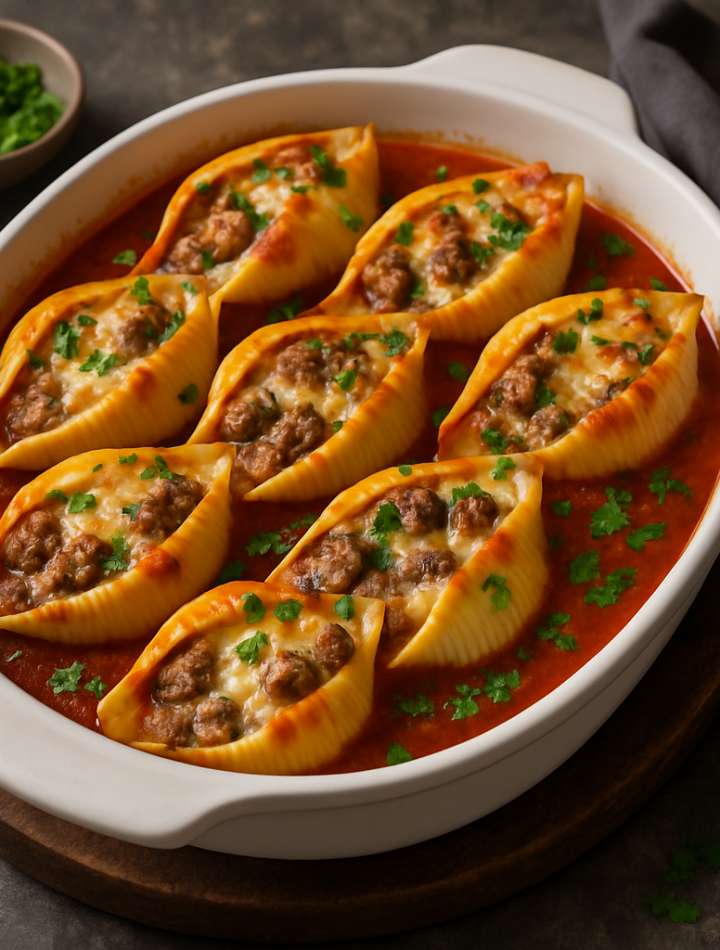 Tender jumbo pasta shells stuffed with a rich blend of chicken liver and three cheeses, baked in savory pasta sauce and topped with fresh parsley for a delicious twist on a classic favorite.