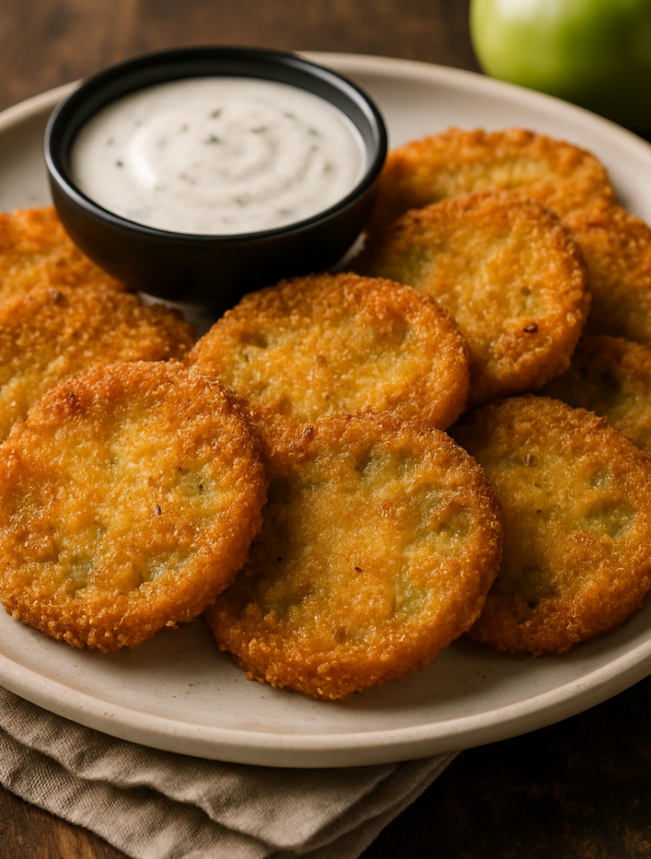 Tangy green tomatoes coated in seasoned cornmeal and fried to a golden crisp, perfect as a savory snack or side dish.
