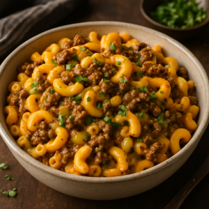 A hearty twist on classic mac and cheese featuring seasoned ground beef, zesty salsa, and mild green chilies for a flavorful, comforting meal.