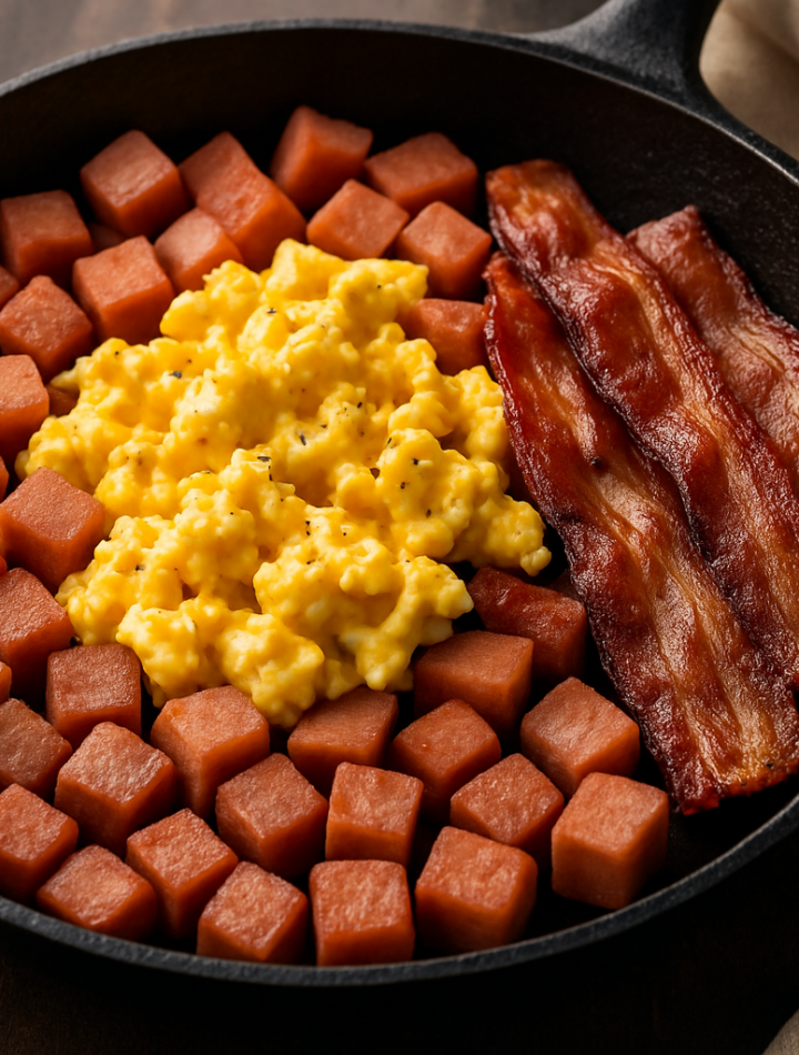 A hearty skillet breakfast combining crispy bacon, multiple servings of savory Spam, and fluffy scrambled eggs for a delicious start to your day.