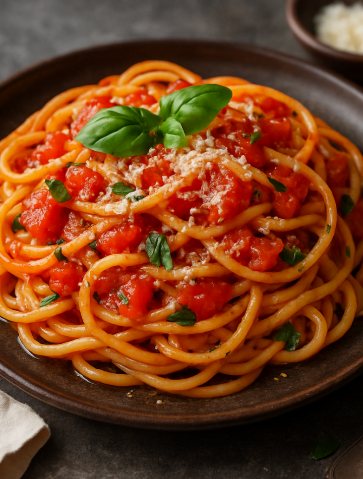 A simple, hearty pasta dish with fresh tomatoes, fragrant basil, and a touch of garlic — perfect for a cozy weeknight meal.