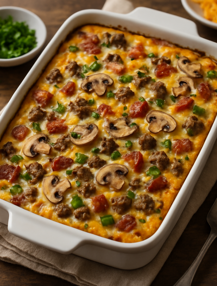 A comforting and savory breakfast casserole loaded with crispy bacon, sausage, peppers, mushrooms, and a melty blend of Swiss and cheddar cheeses — perfect for family mornings or brunch gatherings.