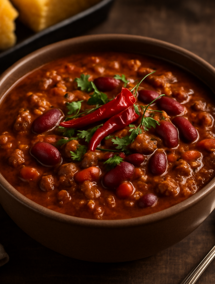 A rich and flavorful Southern-style chili with tender beef, fragrant spices, and a perfect kick of heat from dried red chili peppers, simmered with tomatoes and hearty kidney beans.