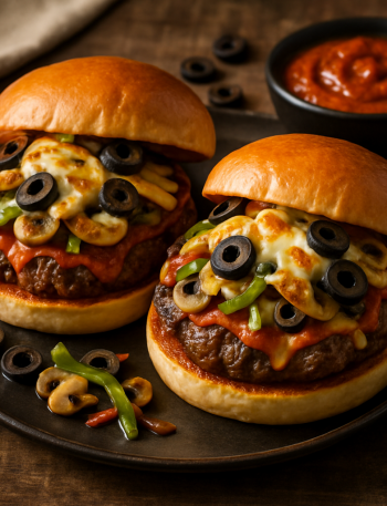 Savory grilled beef patties topped with pizza sauce, mushrooms, sautéed veggies, olives, and melted cheese for a fun twist on …
