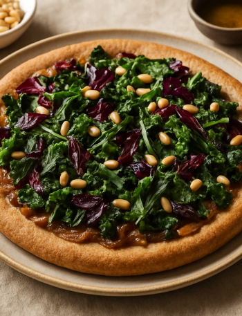 A rustic whole-wheat pizza topped with sweet caramelized onions, toasted pine nuts, and a medley of sautéed bitter greens for …